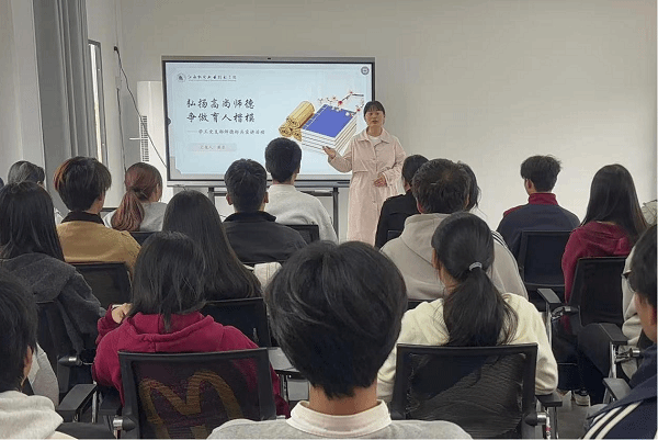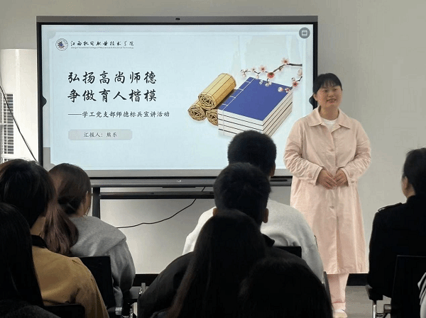 为深入学习贯彻习近平总书记关于教育的重要论述和教师队伍建设的重要指示精神,进一步加强支部教师思想政治与师德师风建设,充分发挥师德标兵的示范引领作用,营造崇尚师德、弘扬教育家精神、争做“四有”好老师的浓厚氛围,学工党支部于2025年10月31日12:40在赣新校区一站式学生服务中心B202培训室组织开展师德标兵宣讲活动。